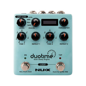Duo Time is a digital delay pedal with dual simultaneous delays, each with independent time and repeat settings. A choice of five very different sounding delay models include Analog, Tape, Digital, Modulation Delay and a unique shimmering Verb delay. A choice of fully independent stereo or mono signal paths are possible, with an option to process a mono input to separate stereo outputs with different delay settings. Controlled via an on/off foot switch and a Tap Tempo foot switch, which also functions as a toggle for the OLED display when held. Add to this versatility a full 40 second looper function and you may never need another delay pedal in your rig except this one.