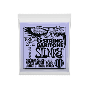 Ernie Ball Nickel Wound 6-string Baritone Electric Bass Strings are made from nickel plated steel wrapped around a hex shaped steel core wire. The plain strings are made of specially tempered tin plated high carbon steel. Each bass guitar string produces a bright, balanced tone and manufactured with small ball ends like guitar strings, not large ball ends used on traditional electric bass strings. These sets are optimal for A-A or B-B tuning combinations and are a perfect match for baritone instruments. Gauges .013, .018p, .030, .044, .056, .072