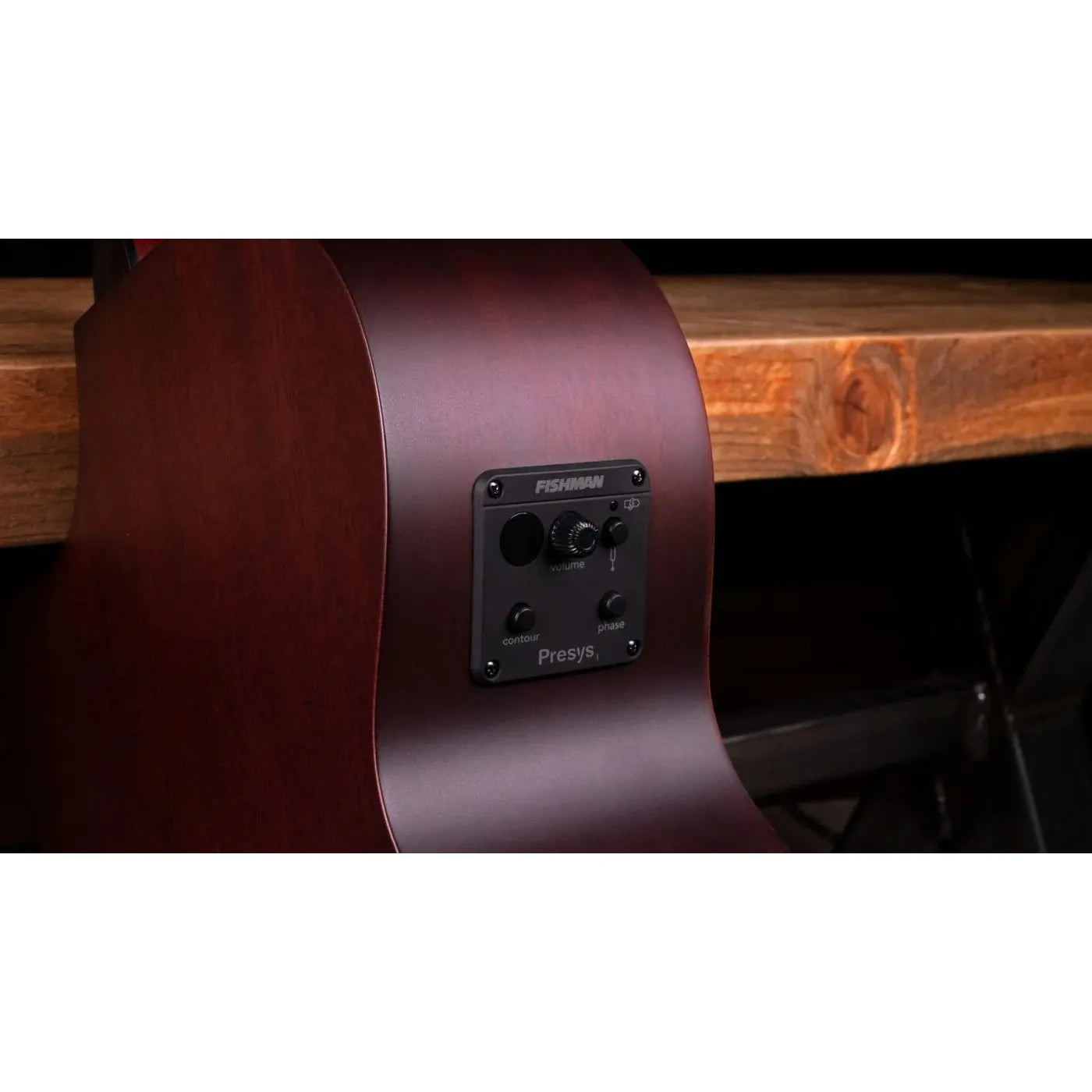 This Naked Venus is equipped with a Fishman Presys 1 preamp system and an undersaddle piezo pickup strip. This elegant solution is super easy to use, with an easy-to-read built-in tuner, an EQ contour control, phase switch (to control any feedback on stage), and a volume knob.